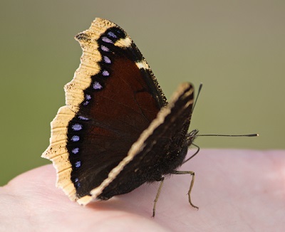 Mourning Cloak butterfly sitting on a handBy Anne Gilbertson / October 6, 2023 (Visited 6 times, 1 visits today)